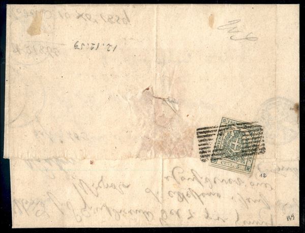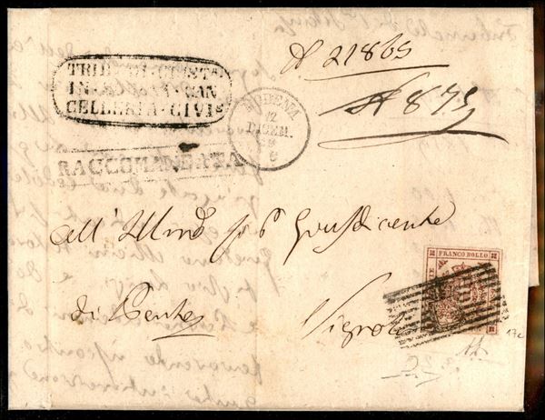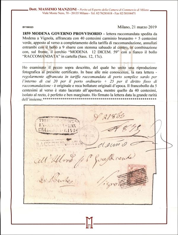 Lettera raccomandata spedita da Modena a Vignola affrancata al recto con 40 cent. gov. prov. isolato (Sass. 17c) e al verso 5 cent. gov. prov., lacerato in apertura (Sass. 12). Il 40 cent., di rara bellezza, isolato è quotato € 55.000. Cert. Manzoni