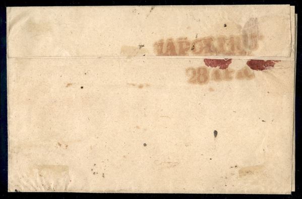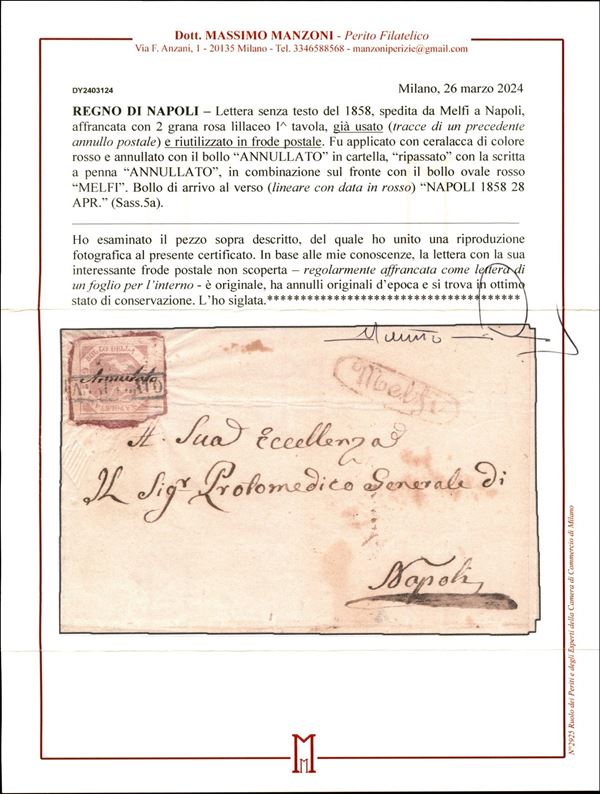 Lettera spedita da Melfi per Napoli e affrancata con 2 gr. I tav. rosa lillaceo riutilizzato il 28 aprile 1858 e annullato con scritta a penna (p. 13). Bella e rara FRODE postale non scoperta (Sass. 5a). Cert. Manzoni