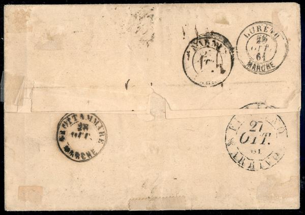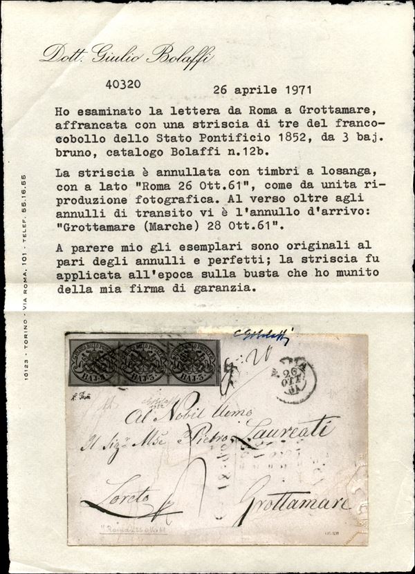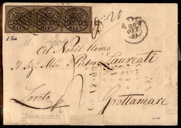 Lettera spedita da Roma a Grottammare con 3 baj bruno striscia di 3 (Sass. 4Aa) Cert. Bolaffi 1971. Tariffa interessante.