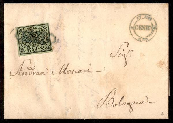 Letterina da Cento a Bologna il 17 marzo 1856 con 2 baj (Sass. 3 a) annullato in Azzurro/verde con bollo lineare. Non catalogato dal Sassone. Gallenga p. 4+1