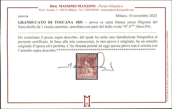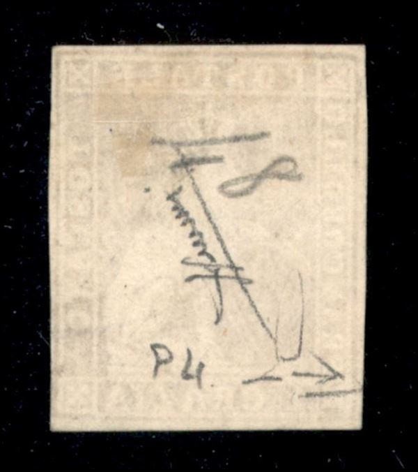 Prova su carta bianca senza filigrana annullata col bollo ovale SaFa (Sass. P4) RARA NON CATALOGATA - cert. Manzoni