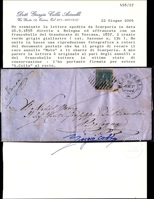 Scarperia (muto a 11 sbarre ovali P.ti R2) su 2 crazie azzurro grigio (5d) pił doppio cerchio grande su lettera per Firenze del 8.2.56 - molto bello - Bolaffi + Diena + Vaccari + cert. Diena