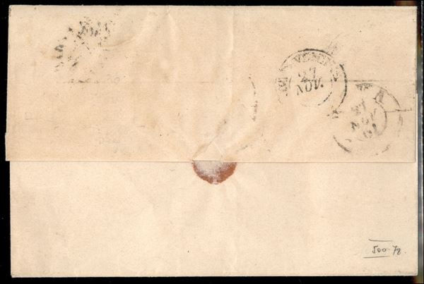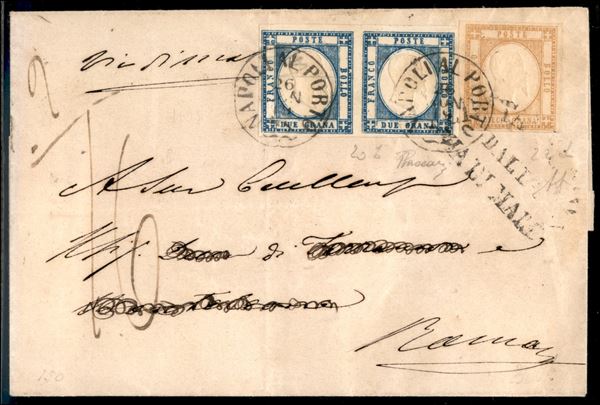 10 grana bistro arancio (22d - perfetto) + coppia del 2 grana azzurro (20b - piega verticale a sinistra) su sovracoperta di lettera da Napoli 26.11.1861 a Roma - bollo via di mare di Civitavecchia coannullatore - tassata 16 bajocchi - molto fresca e di ottimo aspetto - Firma A.Diena