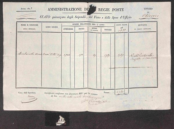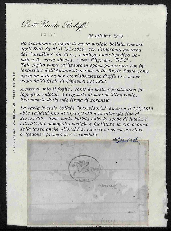1819 - Cavallino 25 cent (2) su foglio di carta postale usato in epoca successiva come carta intestata per corrispondenza d'ufficio - Chiavari 1822 - cert. Bolaffi