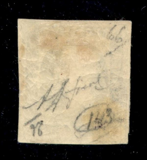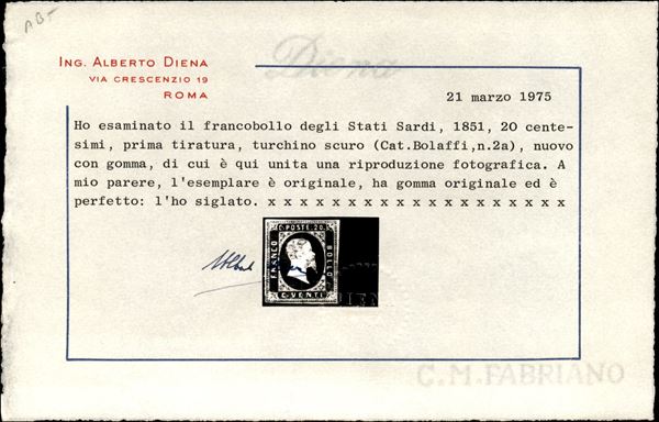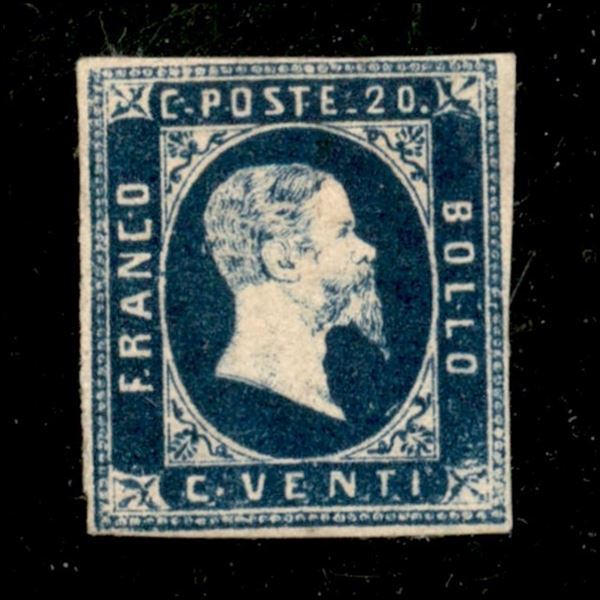 1851 c.20 azzurro scuro, prima tiratura (2a) nuovocon gomma originale, cert. A.D.