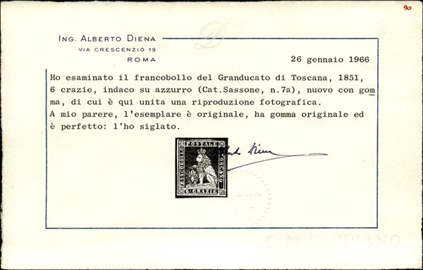 1851 cr.6 indaco su azzurro (7a) nuovo con gomma originale, cert A.Diena