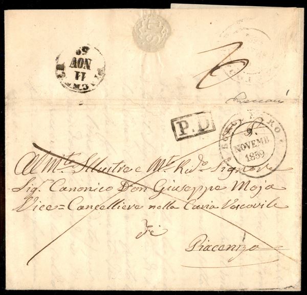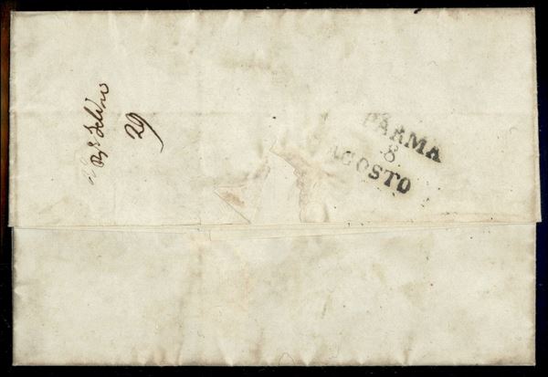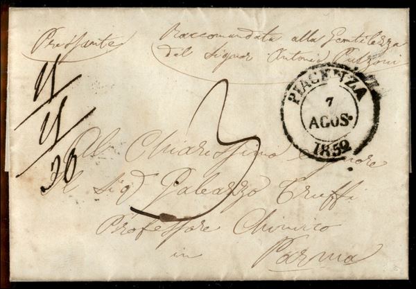 1852/59 - Lotto di tre lettere da BORGOTARO in P.D. con tassa Sarda da 20 cent, lettera da PIACENZA e altra lettera da CASTEL S. GIOVANNI entrambe per Parma con segni di tassa