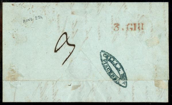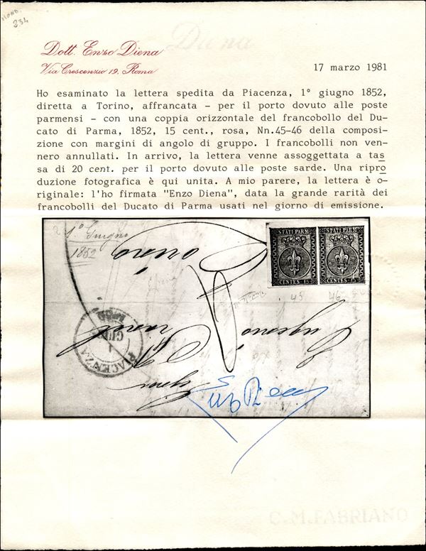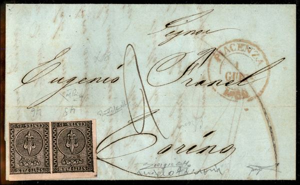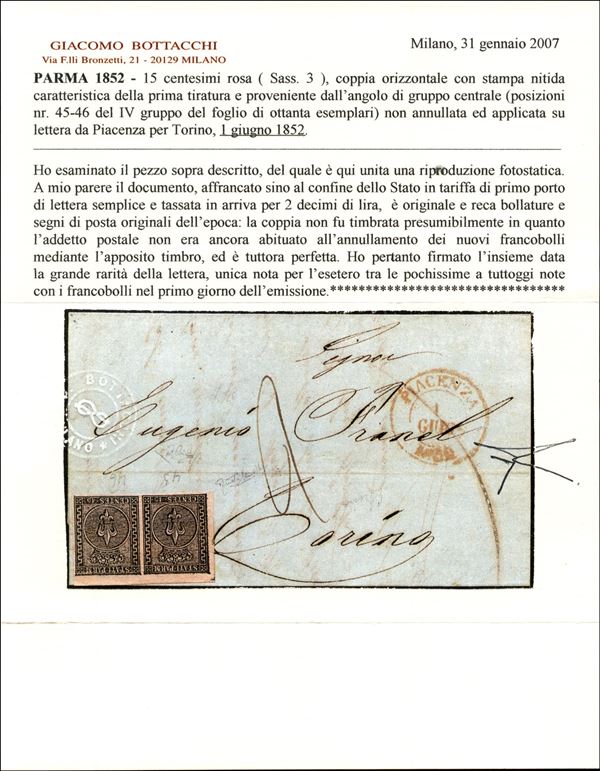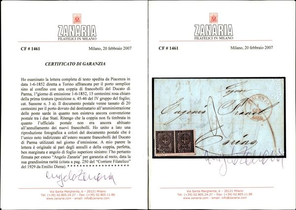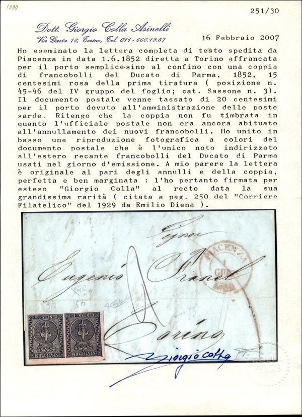 1852 PIACENZA 1 GIUGNO - Lettera indirizzatat a Torino il primo giorno di emissione dei francobolli del Ducato di Parma e Piacenza, si tratta dell'unica lettera inviata all'estero in questa data. Cert. E.Diena, G.Colla, G.Bottacchi, A.Zanaria