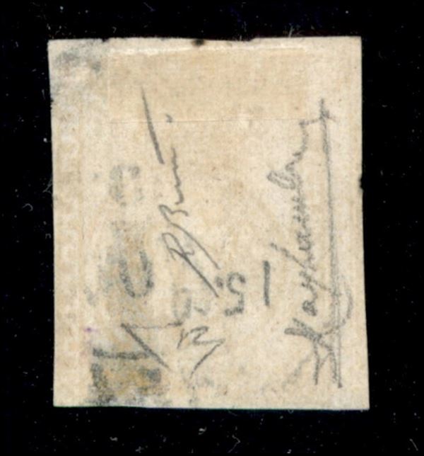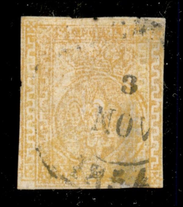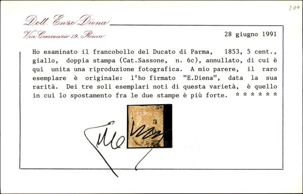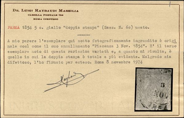 1853 - c.5 giallo arancio (6c) con doppia stampa molto evidente e discosta, annullo di PIACENZA 3 NOV.1854, dal cert. E.Diena "… dei tre soli esemplari noti di questa varietà, è quello in cui lo spostamento fra le due stampe è più forte." - cert. Raybaudi e E. Diena