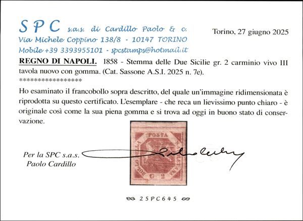 1858 gr. 2 carminio vivo II I tavola (7e), nuovo con gomma originale, cert. Cardillo