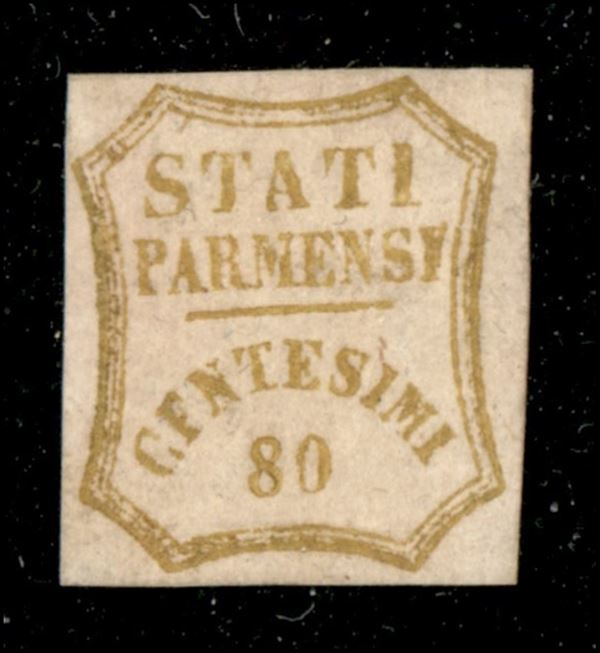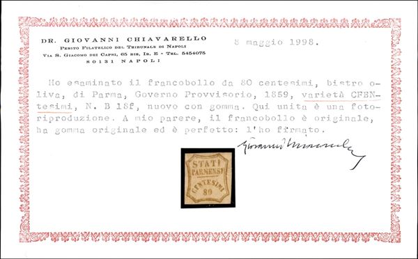 1859 - c.80 bistro oliva, nuovo con gomma con varietà CFNTESIMI (18f) cert. Chiavarello