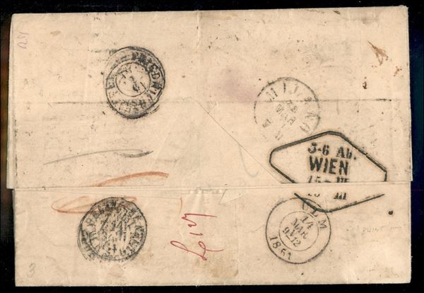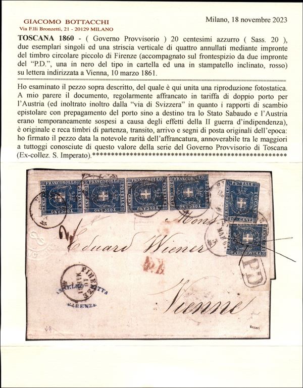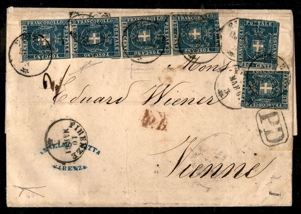 1860 Eccezionale lettera con striscia verticale di quattro + due esemplari del c.20 azzurro da FIRENZE 10 MAR.61 per Vienna, viaggiata via di Svizzera negli ultimi giorni del Regno di Sardegna