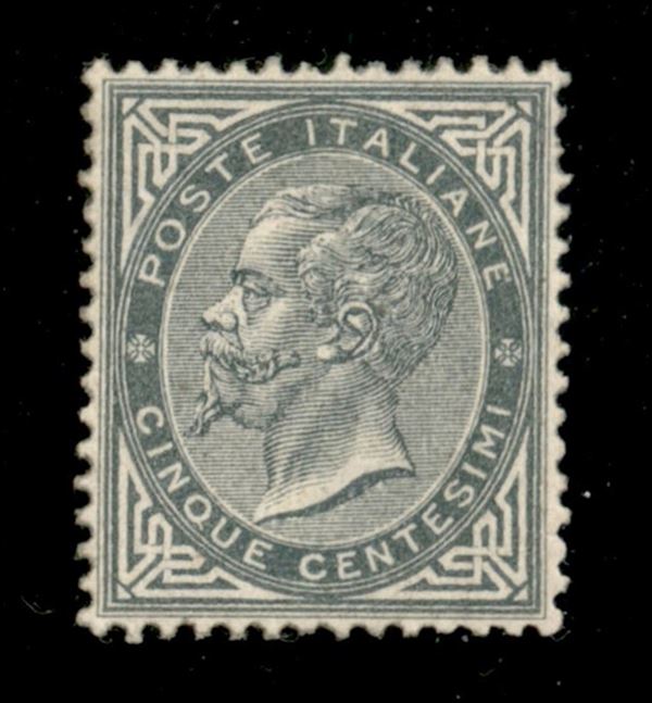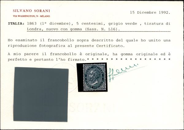 1863 - 5 cent grigio verde (L16) - nuovo con gomma originale ben centrato - cert. Sorani