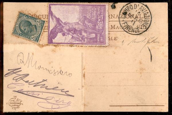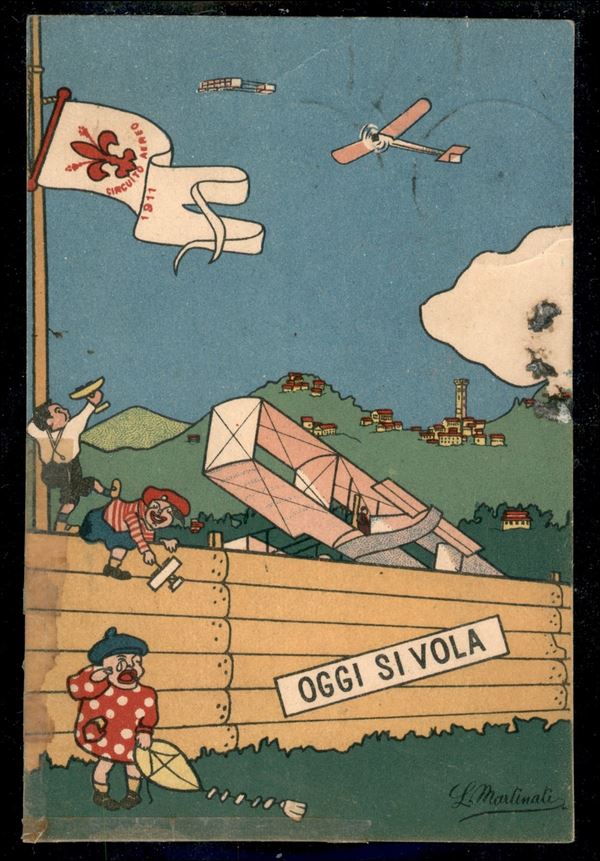 1911 - Firenze Gare di Aviazione - cartolina ufficiale "Oggi si vola" (Longhi 451) con annullo nero CAMPO D'AVIAZIONE FIRENZE 14 MAG 11 (Longhi 449) - firme autografe dei piloti Manissero, Cirri e Dutrieu quest'ultima vincitrice del "Gran Premio Coppa del Re" - molto rara solo quindici cartoline note - cert oro Fabris