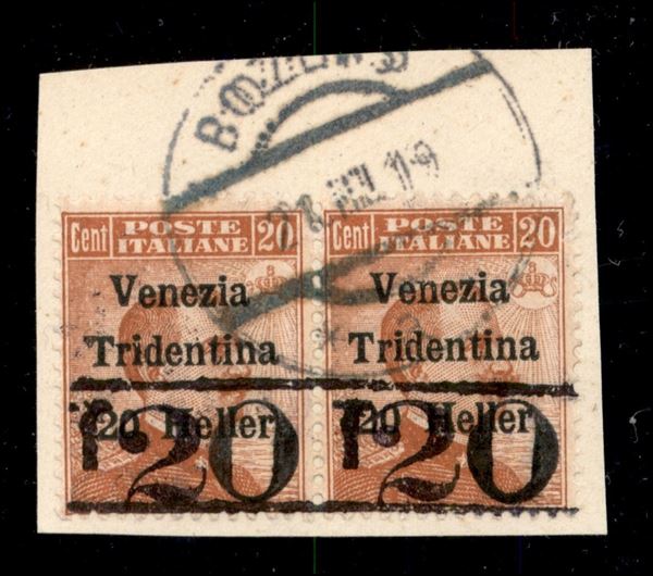 1918 - T20 su 20 heller su 20 cent (BZ3/13) - coppia orizzontale usata su frammento