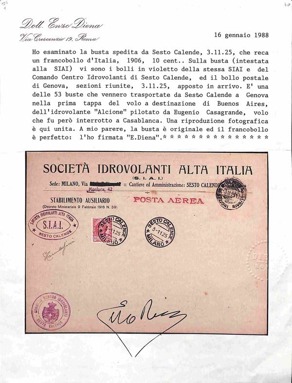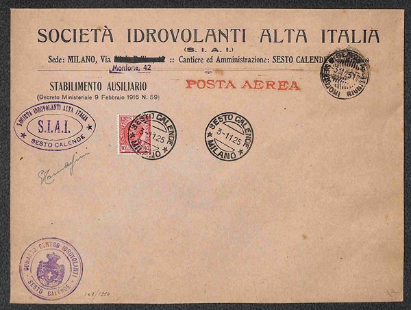 1925 (3 novembre) - Sesto Calende Genova - busta S.I.A.I. per la prima tappa del Volo con timbro violetto Società Idrovolanti Alta Italia + Comando Centro Idrovolanti - dispaccio composto da 53 buste - cert. Diena