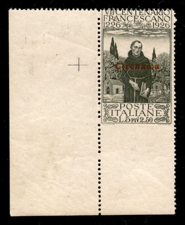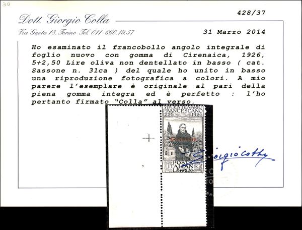 1926 - 5 lire S.Francesco (31ca) non dentellato in basso - angolo di foglio - gomma integra - cert Colla + cert AG (4200)