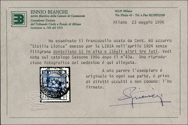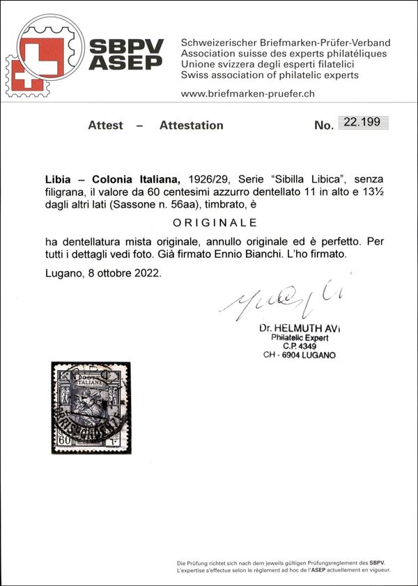 1926/1929 - 60 cent Sibilla (56aa) con dentellatura 11 x 13 1/2 - usato - cert. Bianchi + cert. Avi