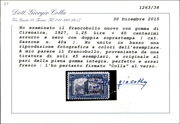 1927 - 1,25 lire Milizia (40a) doppia soprastampa - gomma integra - En. Diena + cert. G. Colla