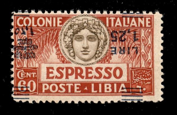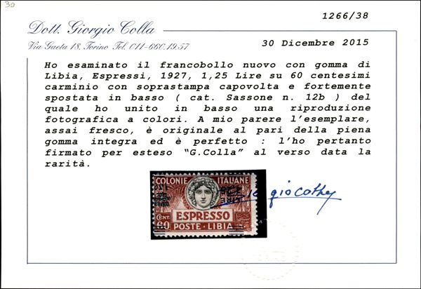 1927 - 1,25 lire su 60 cent (12b varietà) - soprastampa capovolta - 4 sbarrette in alto - gomma integra - cert. G. Colla