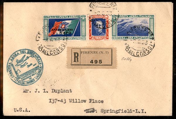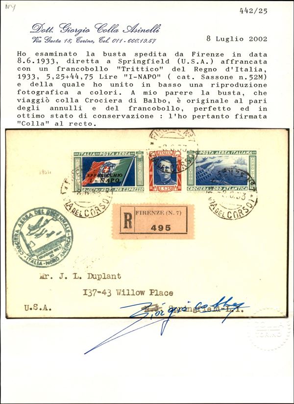 1933 - Crociera Aerea del Decennale - Volo Roma New York - Longhi 2860 - aerogramma affrancato con Trittico I-NATO (52M) del 8.6.33 - cert. Colla