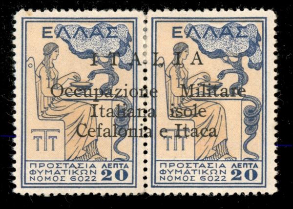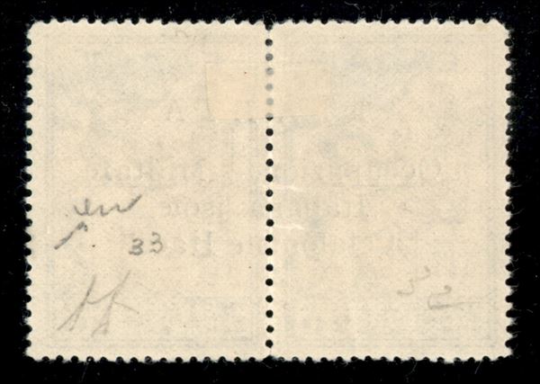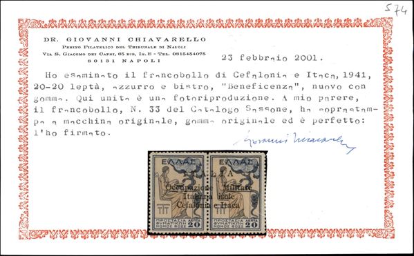 1941 Esemplari in coppia Beneficenza l.20+20 azzurro e giallo (33 cat.900) nuovo con traccia di linguella, firma A.D., cert.Chiavarello