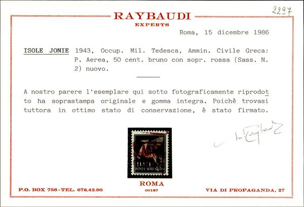 1943 - 50 cent (2 varietà ded) con soprastampa spostata in basso (a cavallo) - gomma integra - non catalogato - cert. Raybaudi