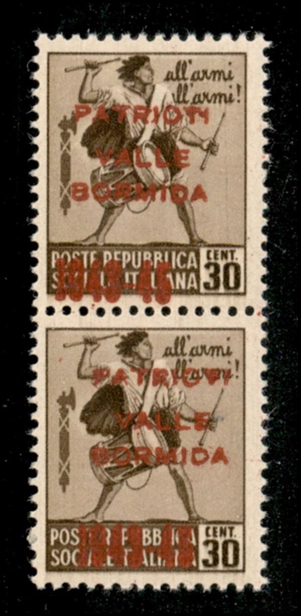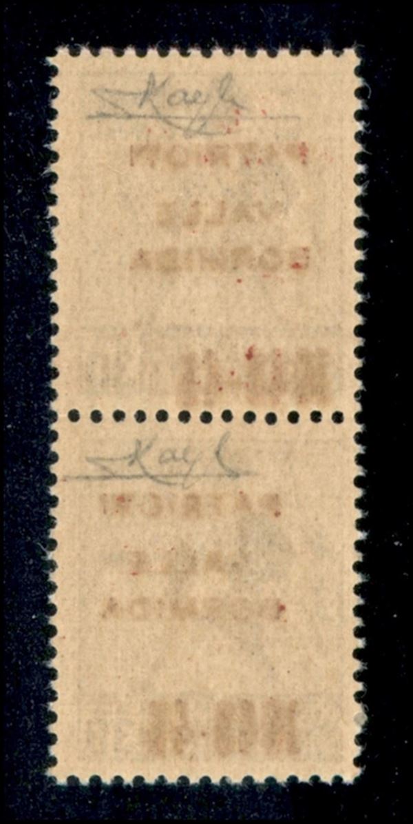 1945 - 30 cent (4A+4A varerà c) - coppia verticale con soprastampe disallineate (spostata a sinistra nel pezzo superiore) - gomma integra - non catalogato - Raybaudi