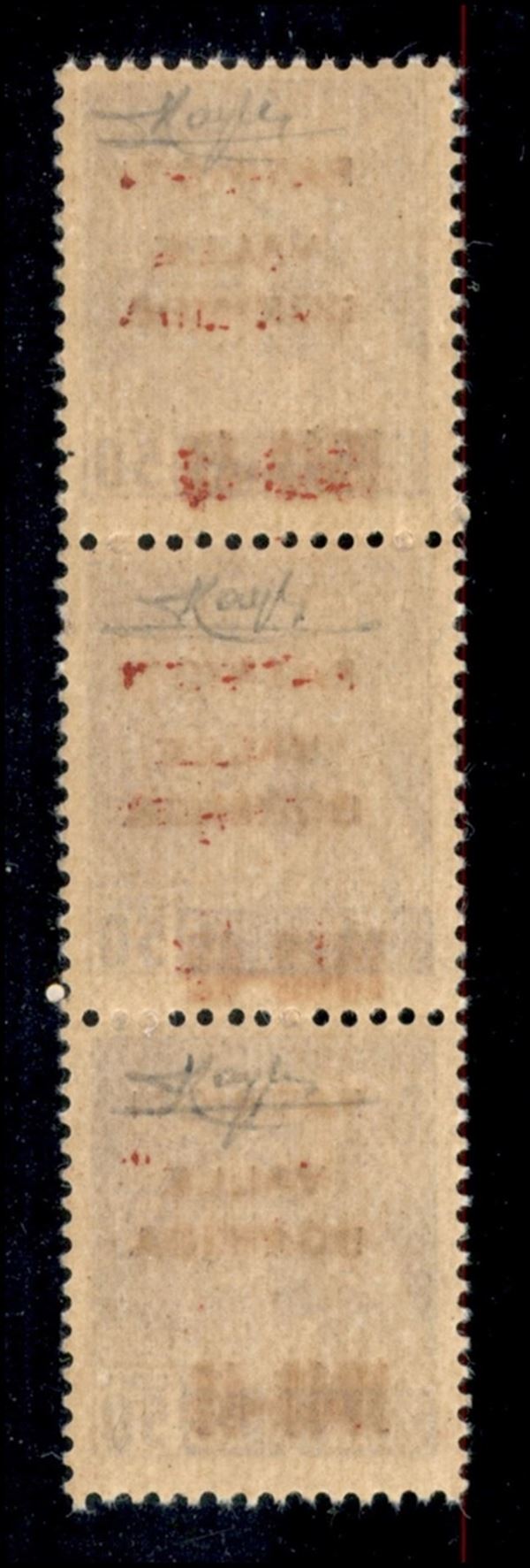 1945 - 50 cent (5A) - striscia verticale di tre con soprastampe diversamente spaziate (in verticale) - gomma integra - non catalogato - Raybaudi
