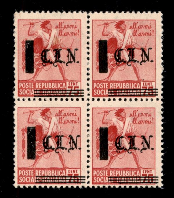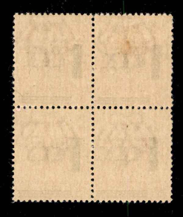 1945 - 75 cent (Errani 10) - quartina con soprastampe spostate e disallineate (fasci visibili) - gomma integra - non catalogati