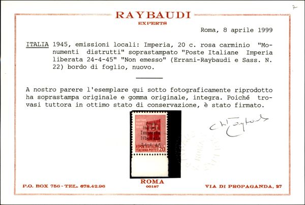 1945 - Non Emesso - 20 cent (22d) senza trattino tra 4 e 45 - gomma integra - cert. Raybaudi