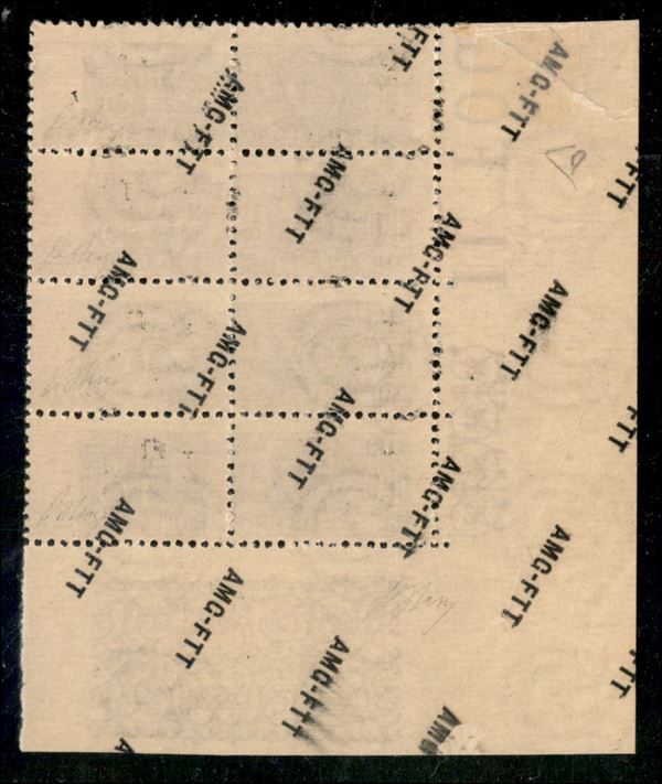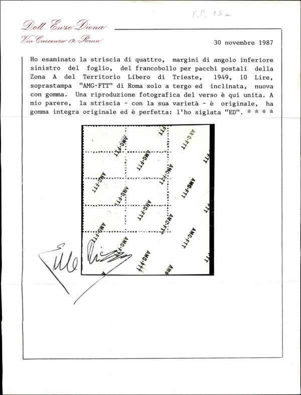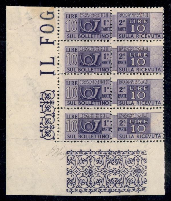 1949/1953 - Blocco di quattro angolo di foglio del 10 lire Pacchi Postali (18a) con soprastampa solo al retro e inclinata - gomma integra (bordo riparato a destra) - Oliva + cert. Diena