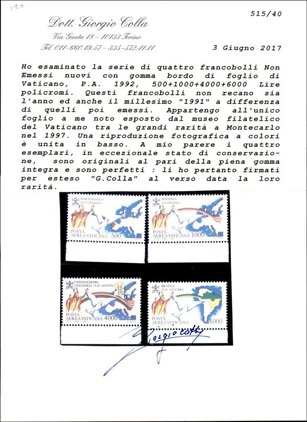 1992 - Serie completa Viaggi nel Mondo Giovanni Paolo II (92A/95A) senza Anno - bordo di foglio - grande rarità - cert. Colla