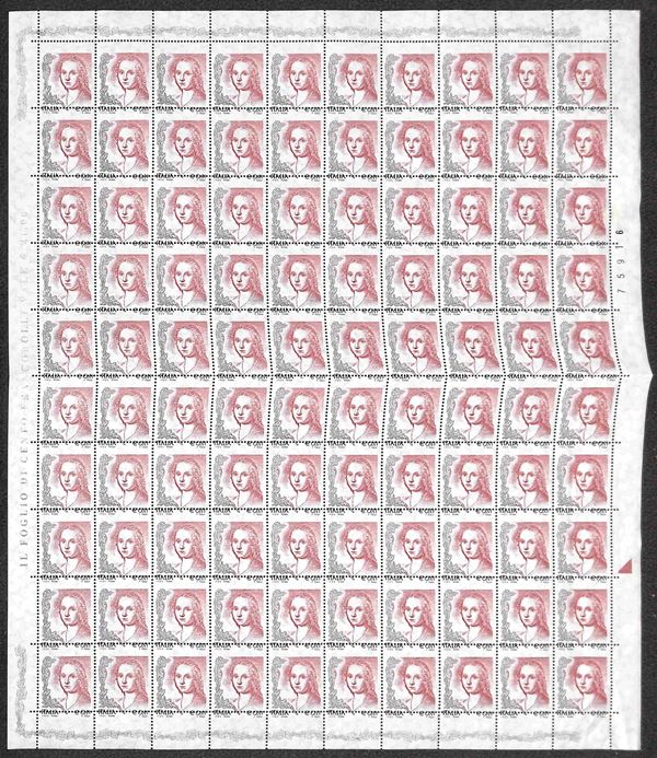 2002 - 0.41 euro (2589 - Specializzato 2228Ea) - dentellatura orizzontale spostata in alto (sopra Italia e valore) - intero foglio di 100 con dieci pezzi senza valore e dieci con valore ripetuto a margine - gomma integra