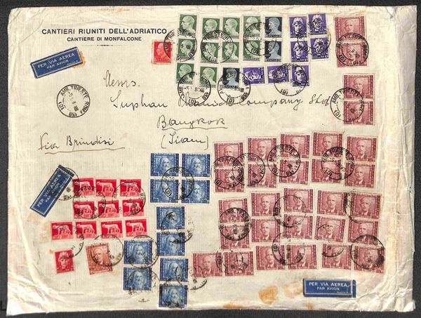 Aerogramma (bustone completo dei Cantieri Riuniti dell'Adriatico) con splendida affrancatura multipla composta da alti valori Imperiale (252 + 255 + dieci 257 + sette 258 + dieci 259 + tre 260) e alti valori della serie Impero (448 + dieci 114 Aerea + trenta 115 Aerea) da Trieste del 5.5.39 per Bangkok (Siam) - altissima affrancatura probabilmente unica nel suo insieme - oggetto splendido da cornice - oltre 28.000 € di catalogo
