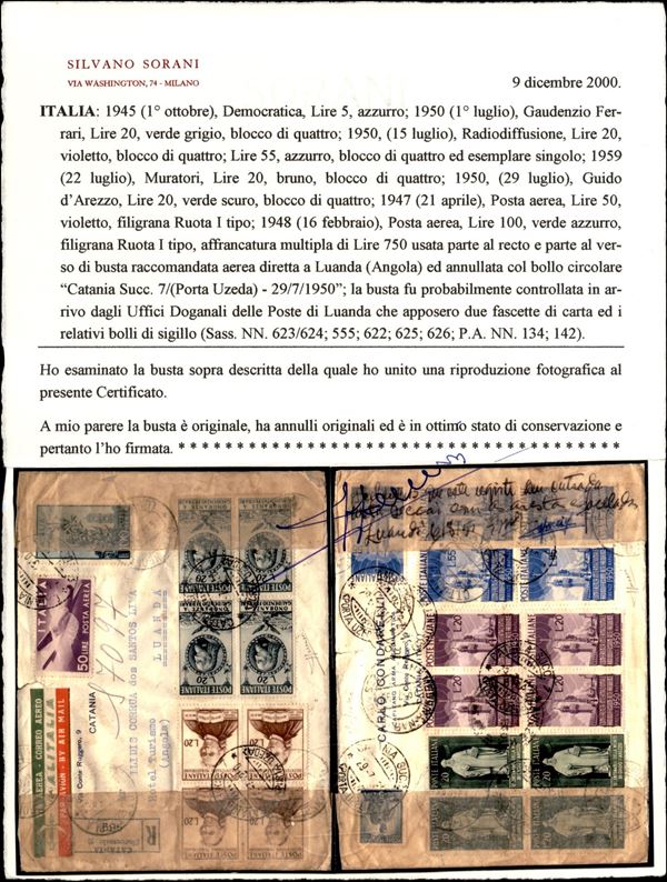 Aerogramma raccomandato da Catania a Luanda (Angola) del 15.7.1950 - spettacolare affrancatura multipla fronte retro di 750 lire - fascette diagonali di controllo ai lati (apposte in arrivo) - cert. S. Sorani