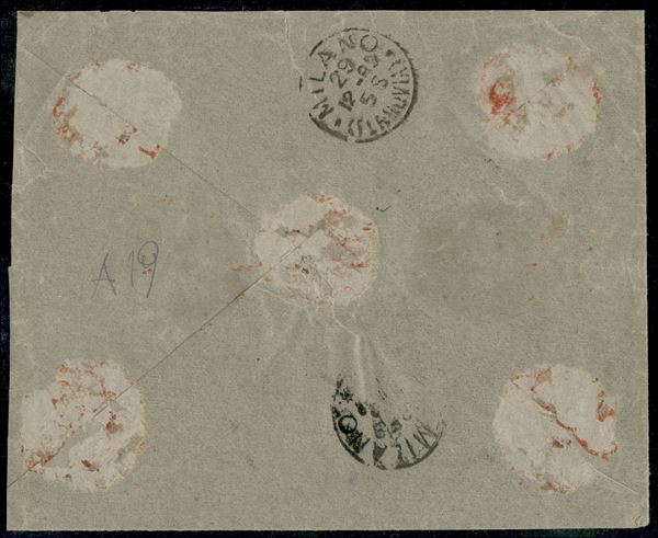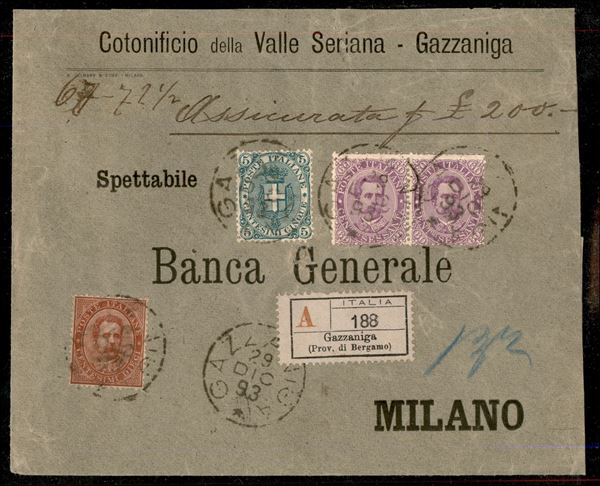 Assicurata con c.5 verde + c.10 carminio + coppia c.60 violetto (38 + 47 + 59 cat.1900+) da GAZZANIGA 29 DIC.93 per Milano