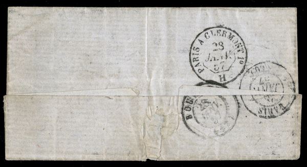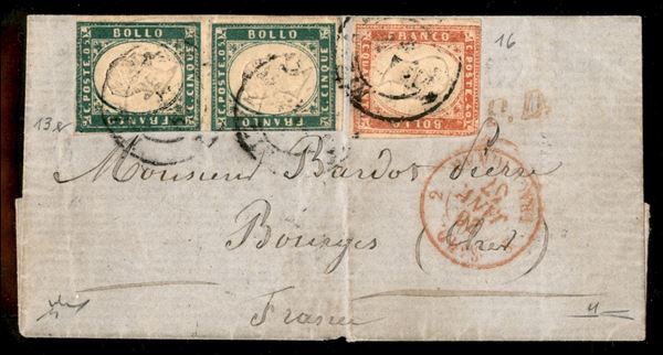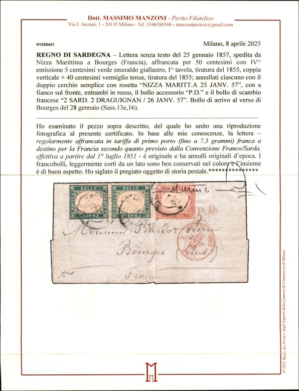 Busta affrancata con coppia verticale del 5 cent verde smeraldo giallastro (13e) + 40 cent vermiglio tenue (16) da Nizza Marittima a Bourges (Francia) del 25.1.57 - francobolli leggermente corti e busta con piega centrale ma che non intacca i valori - cert. Manzoni