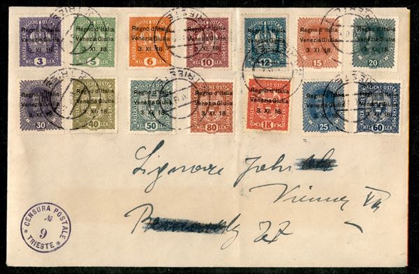 Busta affrancata con quattordici valori della prima serie (1/14) da Trieste del 11.18 - tutti ben dentellati