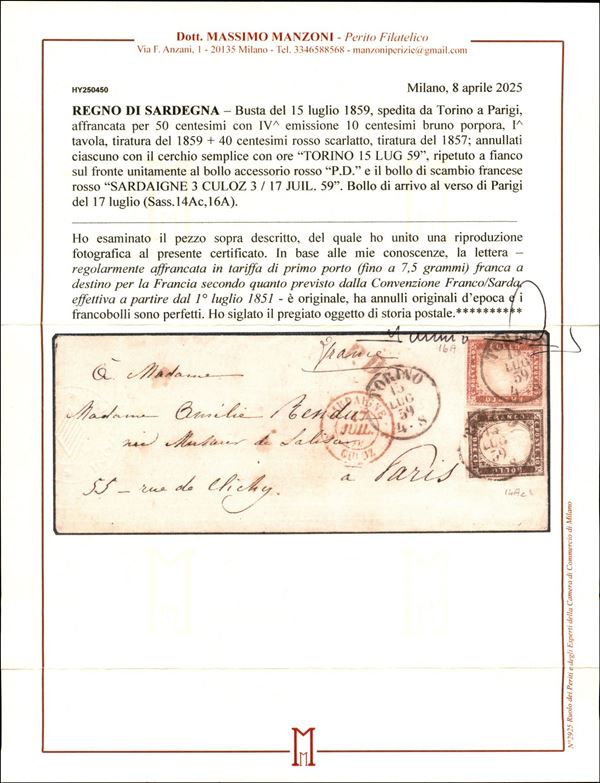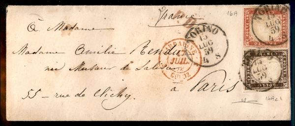 Bustina affrancata con 10 cent bruno porpora (14Ac) + 40 cent rosso scarlatto (16A) da Torino a Parigi del 15.7.59 - pregiato insieme - cert. Manzoni