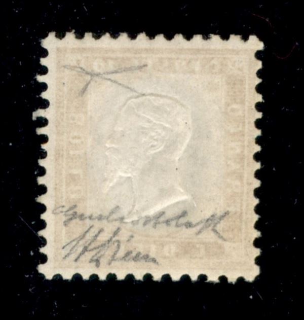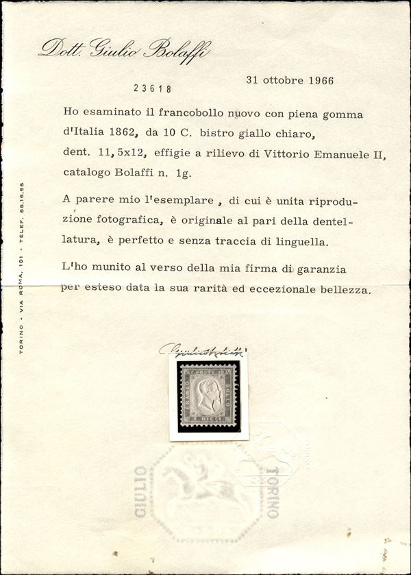 C.10 bistro giallastro, dentellato 11,5 x 12 (1) nuovo con piena gomma integra, esemplare di grande freschezza e ottima qualità, cert. Giulio Bolaffi e AIEP G.Bottacchi
