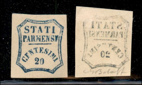 C.20 azzurro, fresco con ampi margini, difetto di clichè nella "I" di Parmensi, firma G.Bolaffi, unito altro esemplare con decalco, ma con leggero assottigliamento