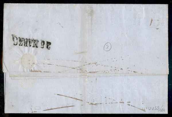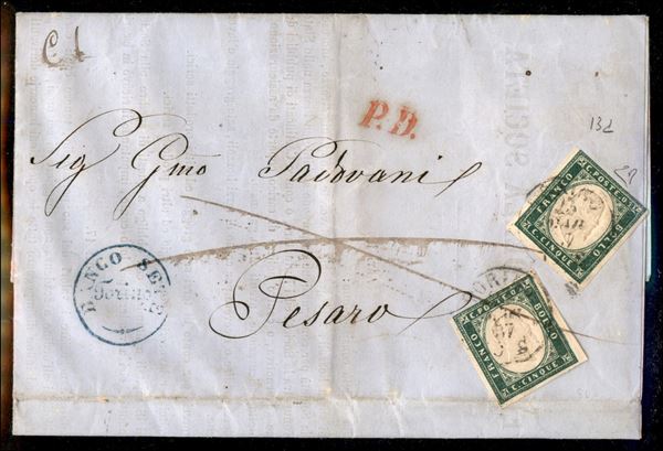 Circolare con due esemplari c.5 verde smeraldo (!3g) da TORINO 23 MAR.57 per Pesaro, estremamente rara