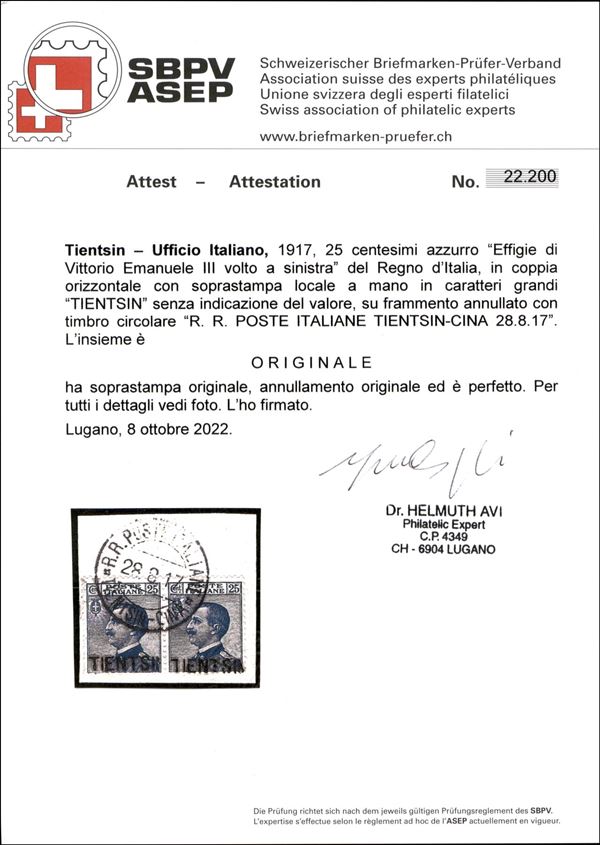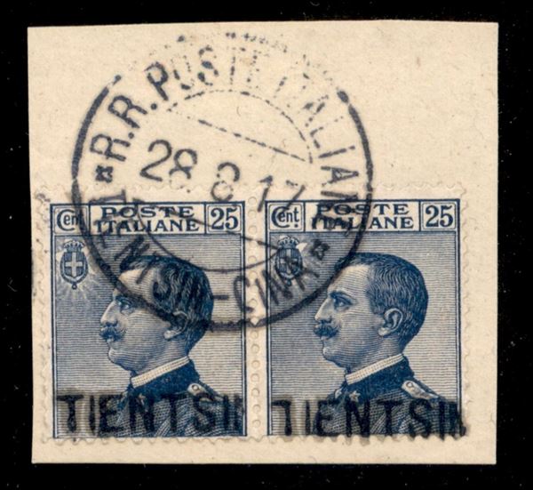 Coppia del 25 cent (9) con soprastampa locale a mano annullata Poste Italiane Tientsin - Cina 28.8.17 - cert. Avi