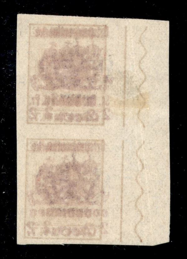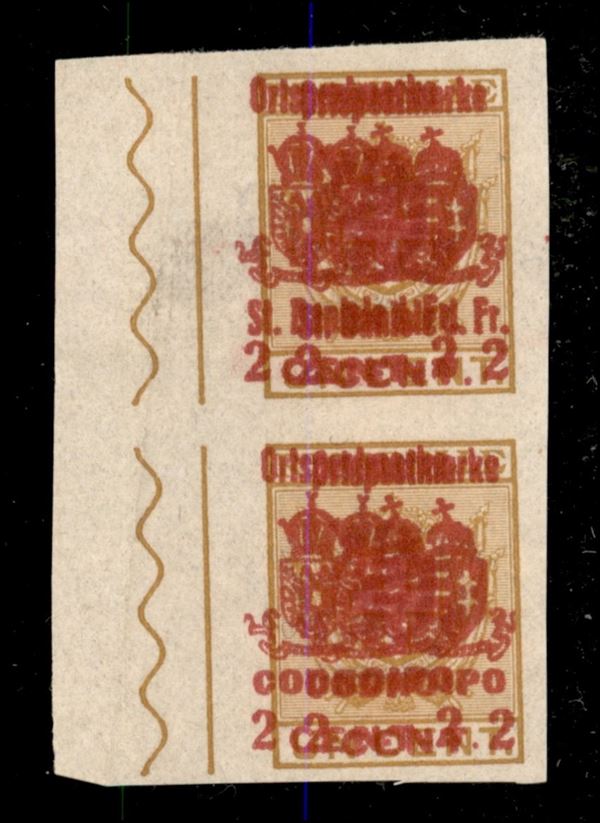Coppia verticale bordo di foglio del 2 su 1 cent (14aa + 46aa) con doppie soprastampe spostate S. Daniele di Fr./Codroipo - rara