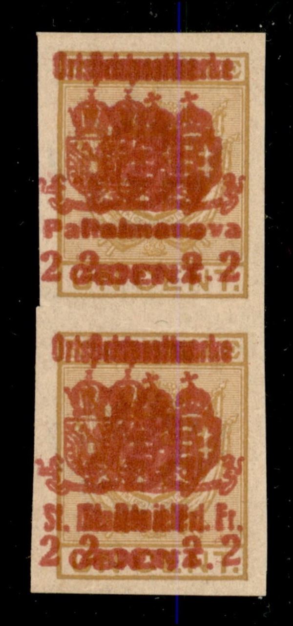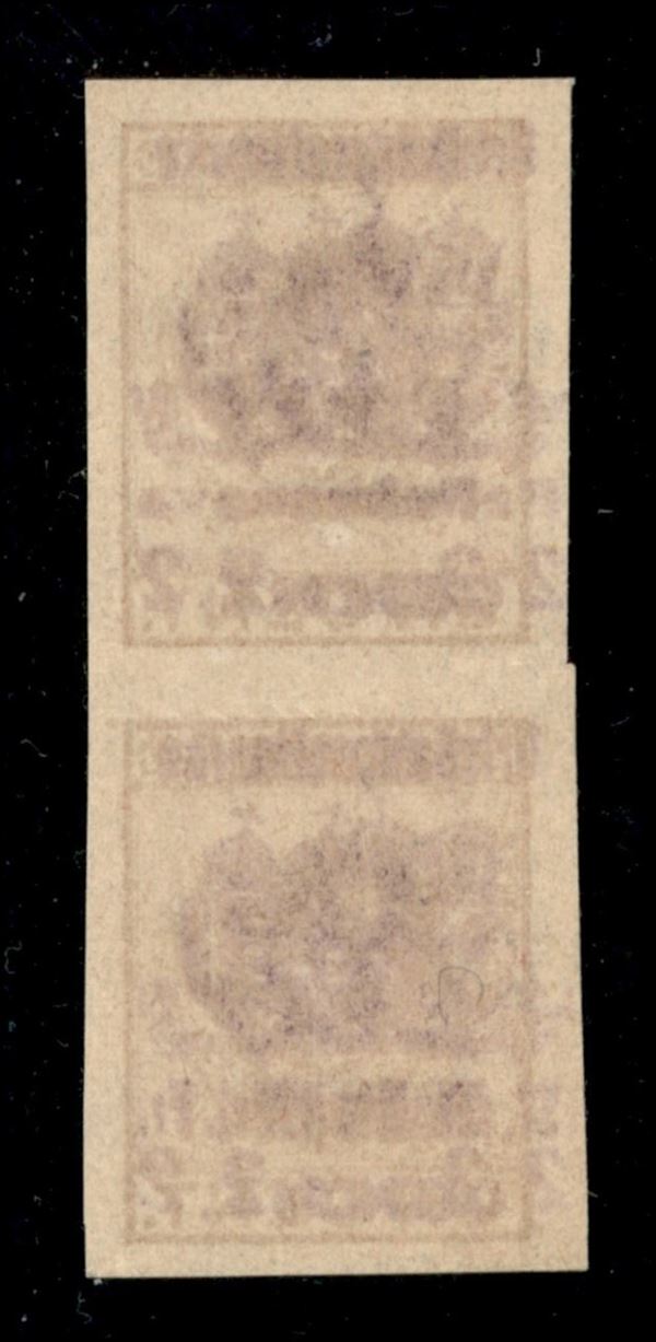 Coppia verticale del 2 su 1 cent (38a + 46a) con doppie soprastampe Palmanova/S. Daniele di Fr. - di pregio