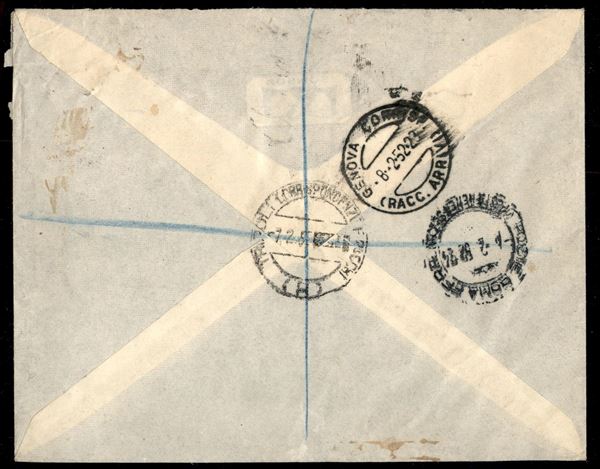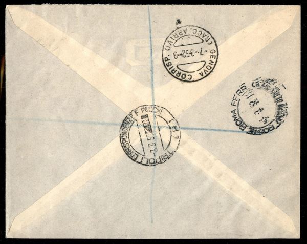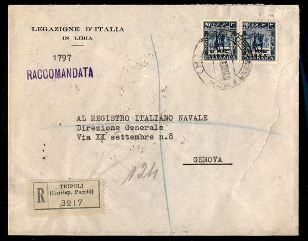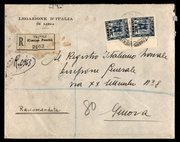 Due raccoandate da Tripoli a Genova entrambe affrancate con Emissioni per la Tripolitania due esemplari soprastampati Lybia m.10 su 20 azzurro (29 cat.800) regolarmente viaggiate e con bollo d'arrivo