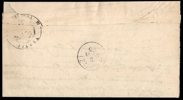 Due Re - Lettera affrancata con 5 cent Umberto (37) + 5 cent Marca da Bollo Vittorio Emanuele II entrambi annullati con bollo amministrativo - Piazza Brembana 5.3.85 - pregevole combinazione - Colla
