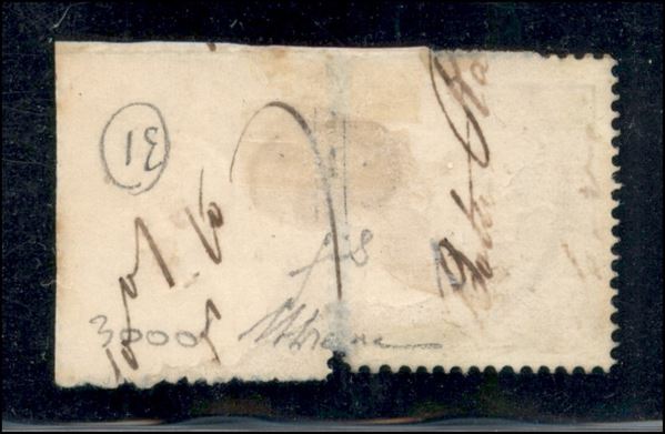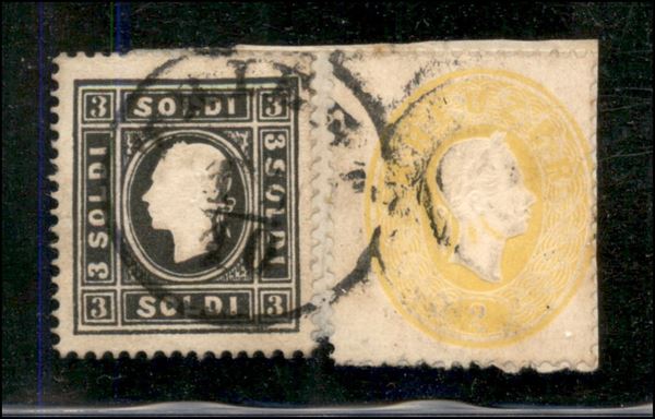 Frammento con 3 soldi secondo tipo (29) seconda emissione + 2 kreuzer (A18) terza emissione annullato Triest 15/10 - molto raro - cert. A. Diena