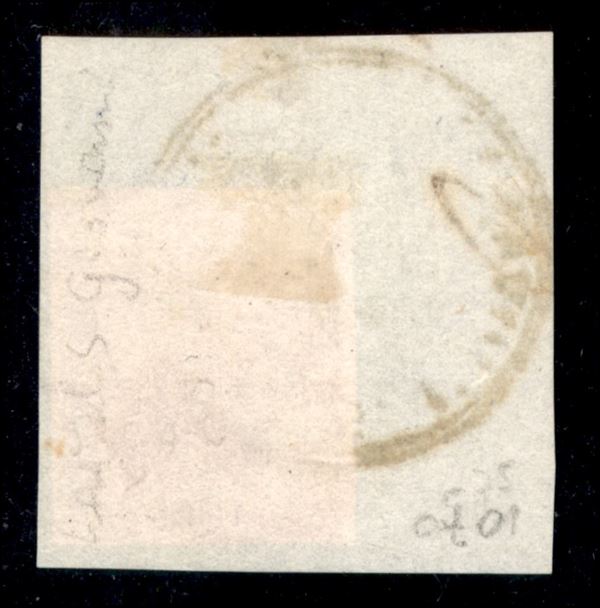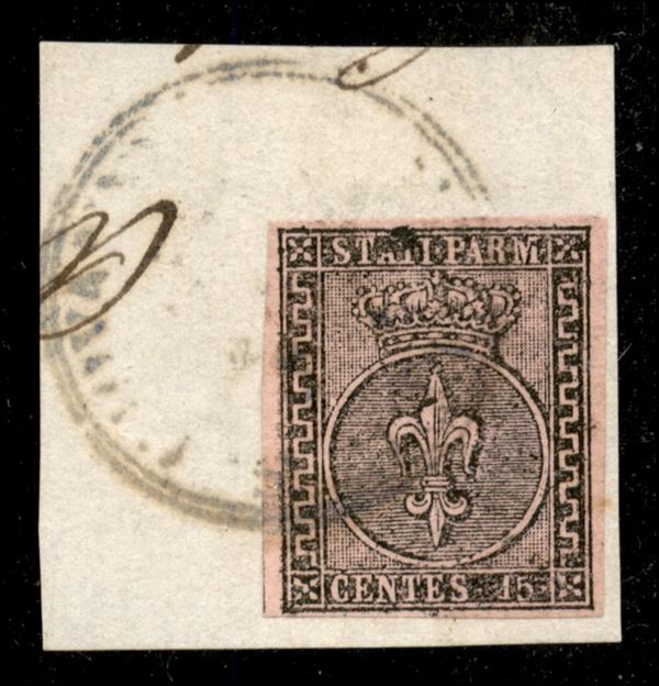 Frammento con c.15 rosa annullo in azzurrastro d.c. con contorno CASTEL S.GIOVANNI